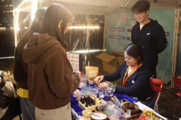 此次集市的创意担当,当属华商学子带来的特色摊位。玉脉智联的DIY手链让大家亲手打造专属东方美学饰品,璃龙盲盒与饰品盲盒的每一次开启,都藏着温润玉韵与祥瑞寓意;气味记忆录则以普鲁斯特效应为基石,五行运势、MBTI人格系列香薰水晶,还有高端定制的记忆景匣,用气味定格时光,成为了许多人珍藏的情感信物。