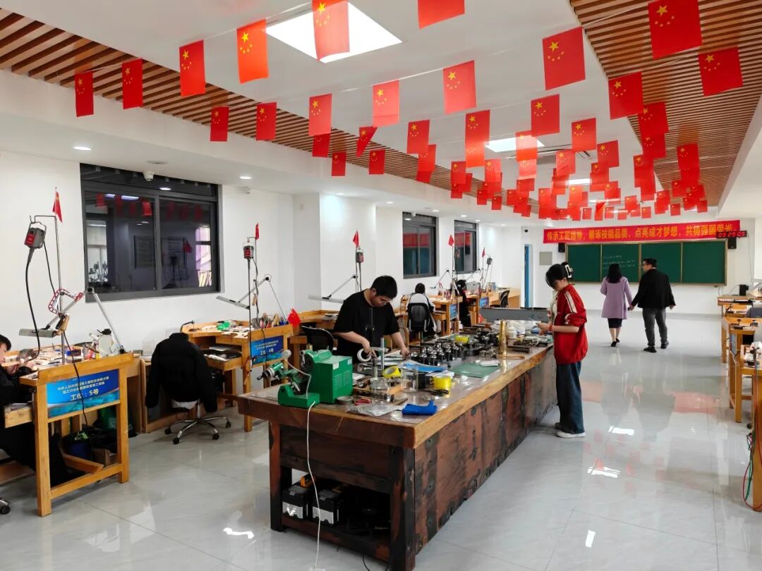 离开博物馆,公司领导团队前往广州南华工贸技师公司,聚焦 “珠宝技工培养体系”,深入学习其在技能人才培育方面的先进经验,在南华工贸技师公司负责人的陪同下,团队走进实训车间、教学课堂,实地参观珠宝首饰设计、制作、鉴定等实训车间。
