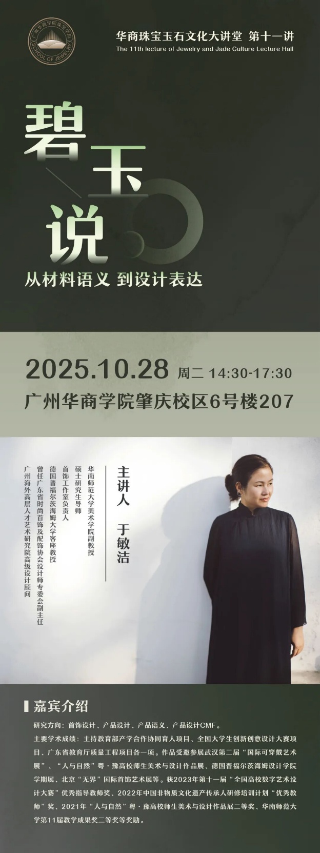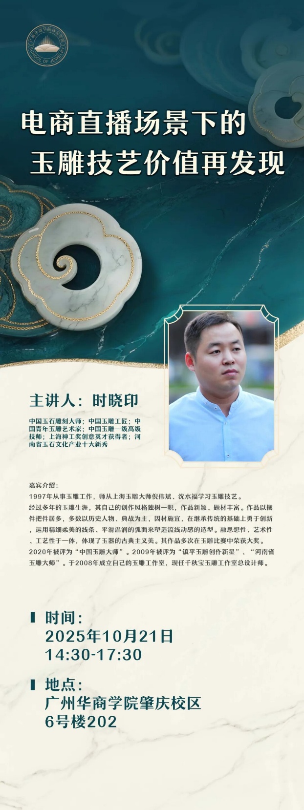 3.“珠宝玉石文化大讲堂”品牌化:本年度共举办大讲堂5讲,先后邀请丘志力教授(中山大学,讲珠宝评估)、于敏洁副教授(华南师大,讲碧玉设计)、赵春华教授(北京服装公司,讲时尚品牌)、时晓印大师(讲玉雕直播)、廖锦文大师(四会玉雕传承人)等开讲,每场讲座均设深度互动环节,累计覆盖师生超500人次。