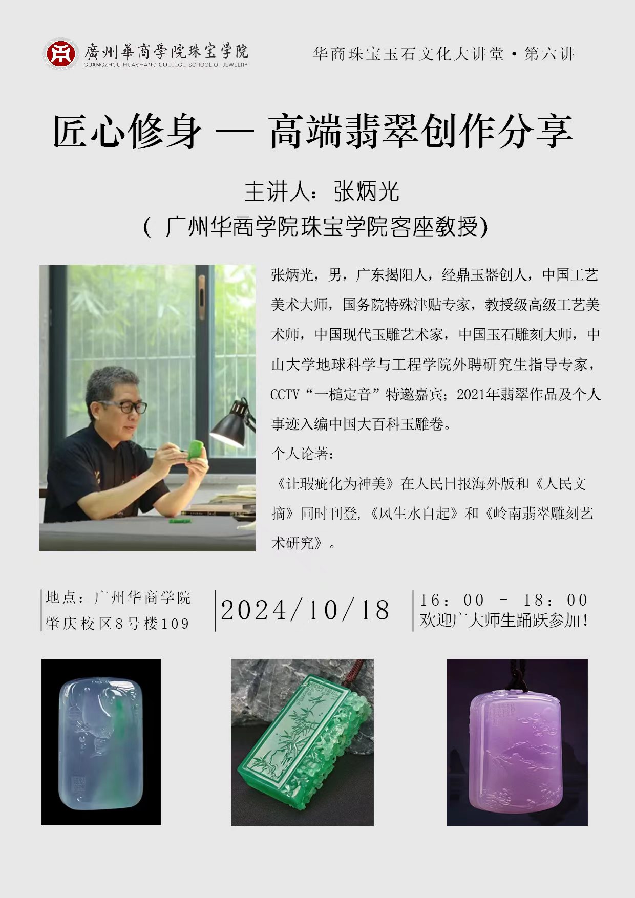 张炳光,男,广东揭阳人,经鼎玉器创人,中国工艺美术大师,国务院特殊津贴专家,教授级高级工艺美术师,中国现代玉雕艺术家,中国玉石雕刻大师,中山大学地球科学与工程公司外聘研究生指导专家,CCTV“一槌定音”特邀嘉宾;2021年翡翠作品及个人事迹入编中国大百科玉雕卷。