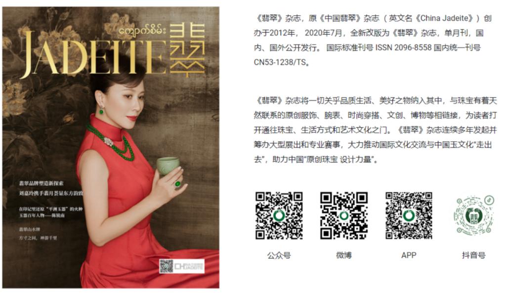 《翡翠》杂志,(原《中国翡翠》《China Jadeite》)创办于2012年,是由云南出版集团主管,云南画报社主办,中翠文化编辑的一份翡翠珠宝杂志,有中文和缅甸文编排。杂志内容丰富、信息量大、可读性强、印制精美,从《翡翠》杂志中可以了解到关于翡翠珠宝首饰业的方针、政策;了解到翡翠资源的分布特点和新发现;了解到翡翠珠宝首饰市场的变化和新动向;了解到国内外翡翠珠宝首饰的新产品、新款式和新工艺;了解到先进的经营管理理念和销售技巧;了解到购买、佩带、保养珠宝首饰的知识和方法,得到珠宝鉴赏、评价的知识,还可以领略博大精深的翡翠文化。 《翡翠》杂志将一切关乎品质生活、美好之物纳入其中,与珠宝有着天然联系的原创服饰、腕表、时尚穿搭、文创、博物等相链接,为读者打开通往珠宝、生活方式和艺术文化之门。《翡翠》杂志连续多年发起并筹办大型展出和专业赛事,大力推动国际文化交流与中国玉文化“走出去”,助力中国“原创珠宝 设计力量”。