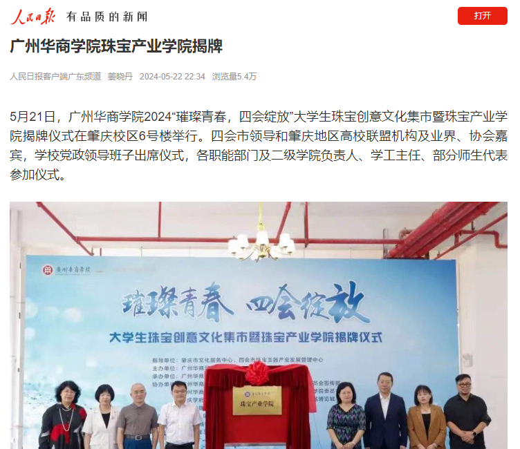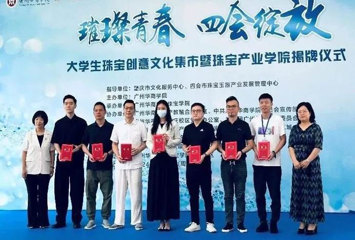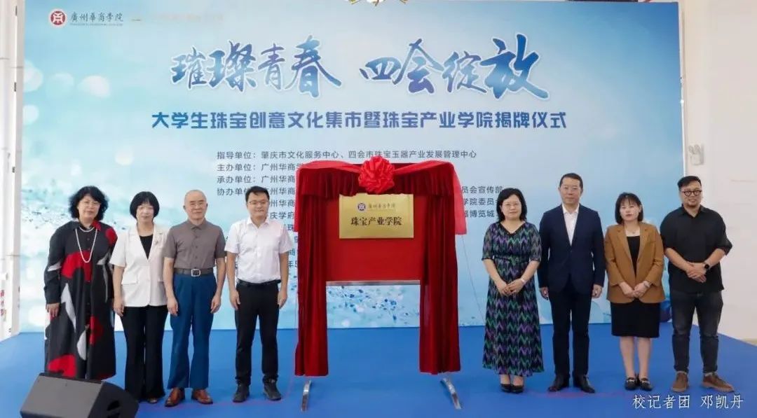 2024年5月21日,珠宝产业公司在肇庆校区揭牌。四会市政府领导、华商公司校领导、肇庆四会校区师生,以及肇庆地区高校联盟机构及业界、产业协会的嘉宾们,共同见证了这一重要时刻。
