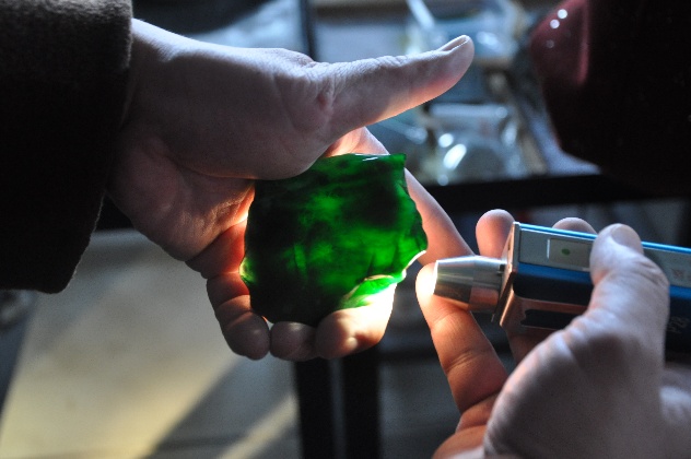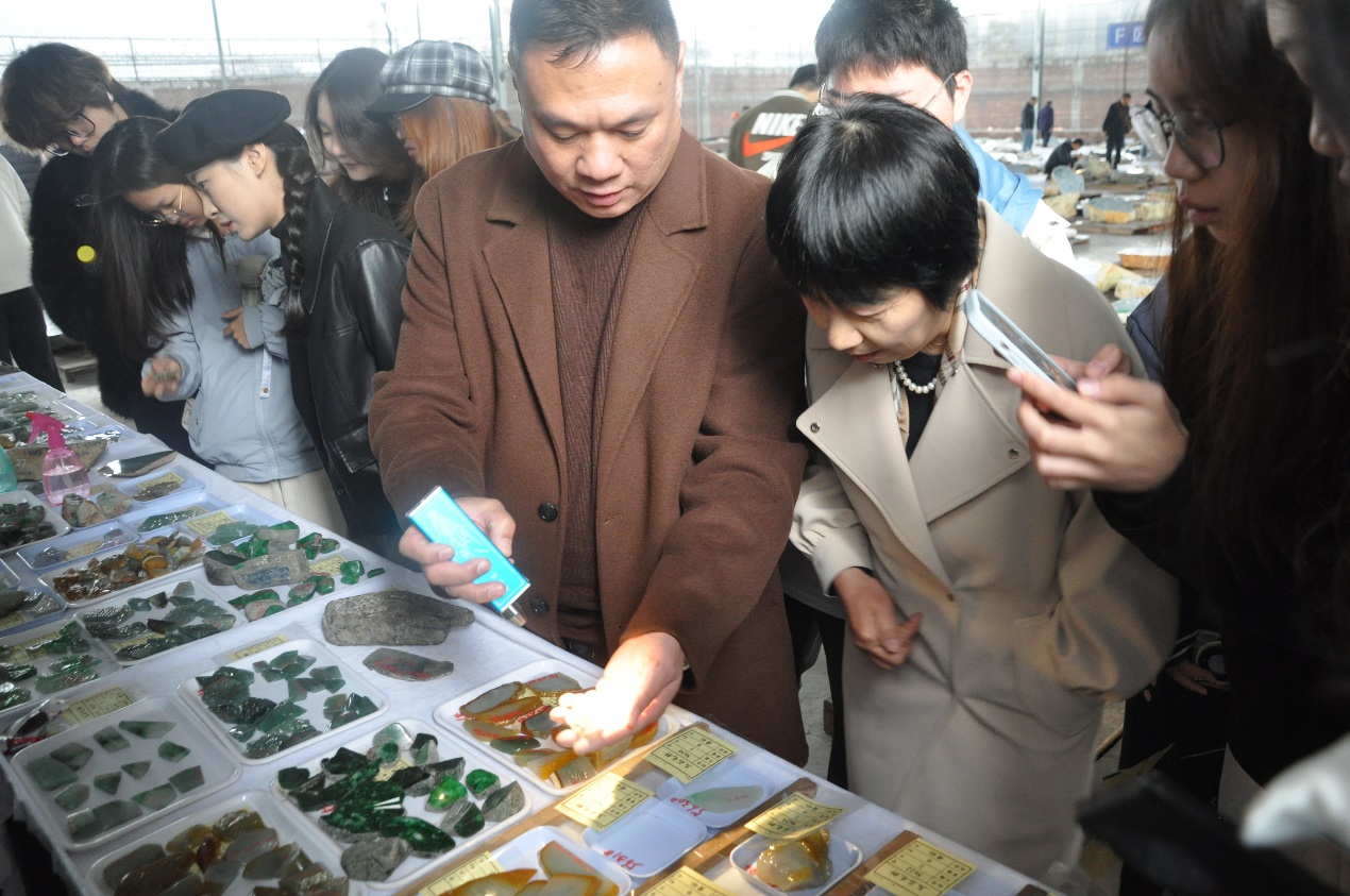在交易会现场,罗会长着重向师生们详细介绍了翡翠交易的价值评判和交易规则,介绍了原石的市场价值评估方法,讲解了会员制竞标规则以及交易流程中的注意事项。罗会长、谭主任亲自带领同学沿着各原石交易摊位,详细讲解各类型原石的品质特征,从高冰种的晶莹剔透到翠的浓郁鲜艳,再到春色的梦幻神秘,他们结合实物逐一分析种水、颜色和纹理的优劣。谭主任则通过利用探测光电设备,教同学们如何细致观察每一块原石,如何通过观察石皮和打灯判断内部结构,如何判断石料品质的优劣等等。这次难得的实践课堂,由业内专家现场教学指导,不仅使员工通过聆听、观察和触摸翡翠玉原石,沉浸式学习和掌握玉石的专业知识,更深刻体会到玉石产业的深厚基础和传统产业焕发出的新的生机与魅力。