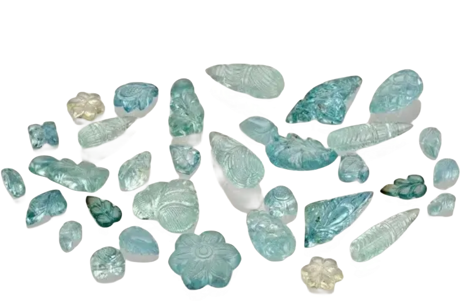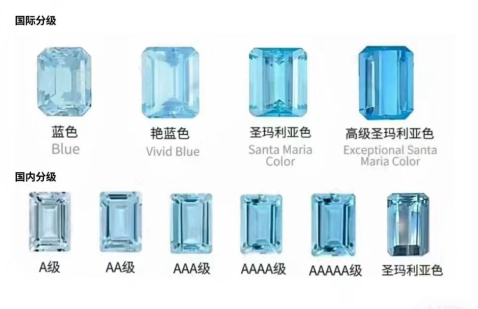 海蓝宝石的颜色主要由微量的二价铁离子(Fe2+)引起,通常呈现天蓝色至海蓝色或带绿的蓝色。颜色越深、越纯净的海蓝宝石价值越高。其中,被称为“圣玛利亚蓝”的海蓝宝石,以其明亮、湛蓝且不带棕(黄)色调的蓝色而闻名,是海蓝宝石中的极品。