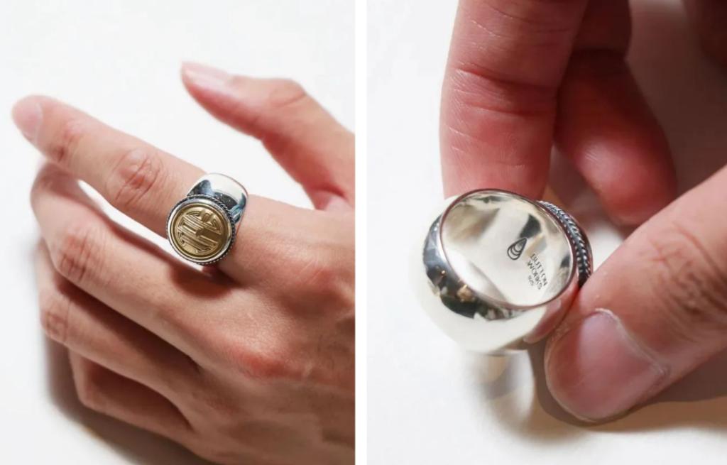 例如:Buton Works品牌忠于对古着物品与古老技术的应用和使用,譬如旧服装零件、银币、广告纸等等材料,都被重新打造成了包装袋、饰品、家具摆设等。这款戒指是用古着服饰上的纽扣打造的戒指,通过对旧衣零件的纽扣、拉链等配件进行再设计,将这些已经被废弃的“边角料”重新以现代着装的形式重新回到人们的生活中,就是Button Works 创始人的初衷。