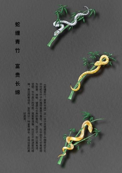《蛇缠青竹·富贵长绵》设计思路:《蛇缠青竹·富贵长绵》这一设计灵感源自于中国传统文化中对蛇与竹子的独特寓意与象征。蛇,在中国文化中常被视为智慧、神秘、健康与长寿的象征;而竹子,则以其高洁、坚韧、节节高升的特质,寓意着清廉、纯洁与不断进取的精神。将这两者结合,旨在传达一种富贵绵长、吉祥如意的美好愿景。