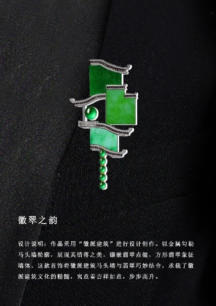 《徽翠之韵》设计思路:作品采用“徽派建筑”进行设计创作。以金属勾勒马头墙轮廓,展现其错落之美。镶嵌翡翠点缀,方形翡翠象征墙体。这款首饰将徽派建筑马头墙与翡翠巧妙结合,承载了徽派建筑文化的精髓,寓意着吉祥如意,步步高升。