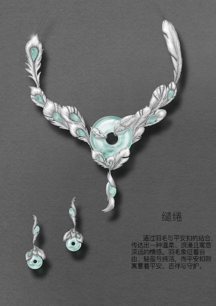 《缱绻》设计思路:通过羽毛与平安扣的结合,传达出一种温柔、浪漫且寓意深远的情感。羽毛象征着自由、轻盈与纯洁,而平安扣则寓意着平安、吉祥与守护。